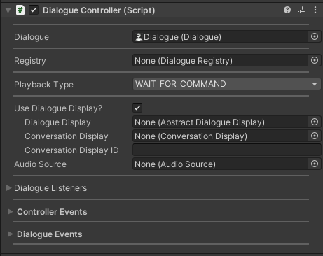 | Dialogue Listeners | Dialogue Listeners to call as events happen during dialogue playback. Controllers automatically register and unregister Dialogue Displays as needed, but you can add your own Dialogue Listeners here if you want to implement custom logic that responds to dialogue playback. |