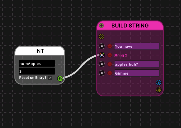 Build String nodes are used to create a string dynamically at runtime during dialogue playback. The values of each field/input in the build string node are concatenated to produce an output string, which is sent on to the string value output of the node.
